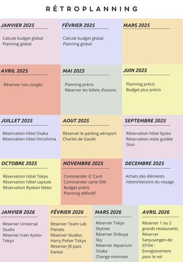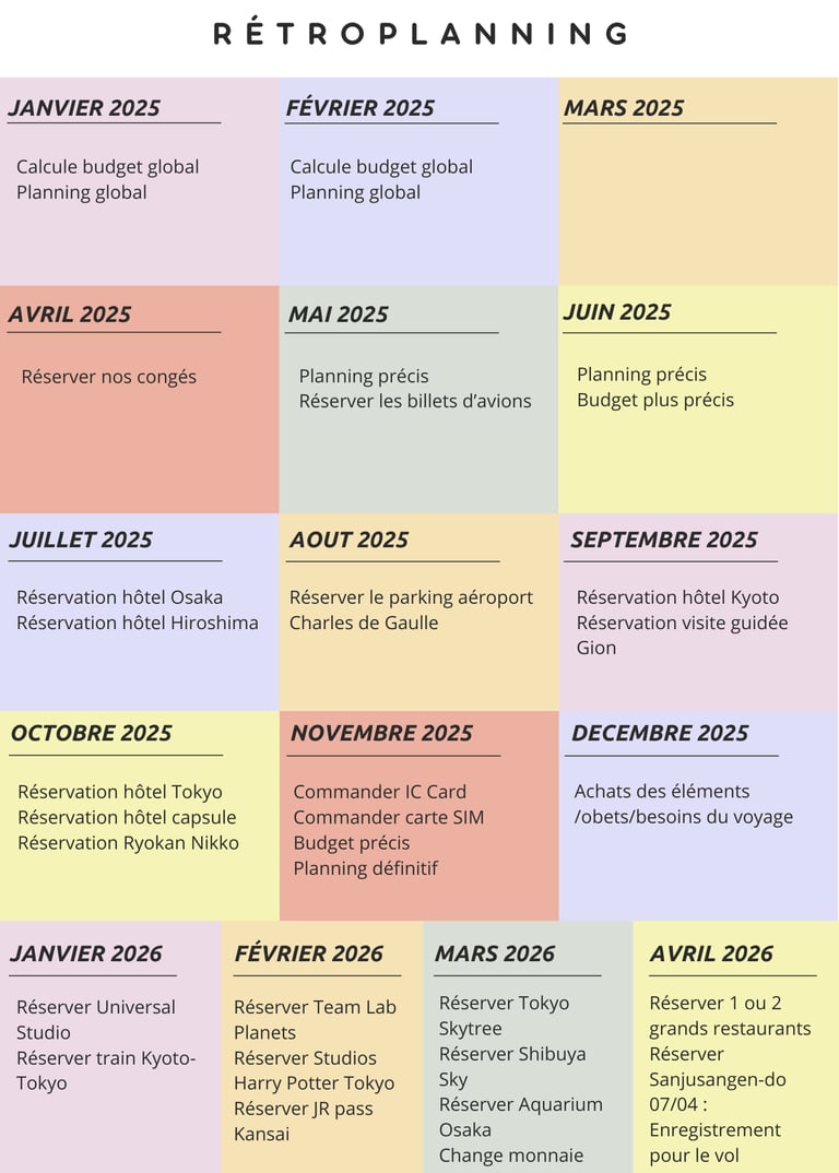 Ce planning a beaucoup bougé au fil de nos recherches, afin de l'optimiser au maximum. Mais puisque faire des choix, c'est aussi renoncer, il faut avoir en tête rapidement que non, nous ne pouvons pas tout faire... De la même façon, nous avons aussi définit des priorités de visites pendant les journées, et même des visites que nous pouvons nous permettre de louper si nous manquons de temps, ou bien si nous changeons un peu le programme une fois sur place. Nous souhaitions avoir des jours off, un par ville, mais finalement nous avons plutôt opter pour des journées moins chargées parmi les autres. Seule le dernier jour de notre voyage, le 1er mai (jour de mon anniversaire !!) sera off, de quoi faire ce que nous aurions loupé à Tokyo ou bien faire les derniers achats avant le départ.